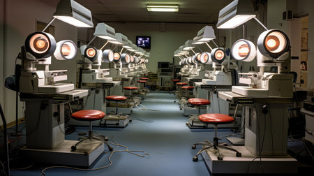 This image showcases a well-equipped hospital operating room featuring a surgical table under dramatic overhead lights, creating a captivating atmosphere.