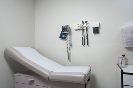 Otoscope and ophthalmoscope set mounted on clinic wall beside exam table