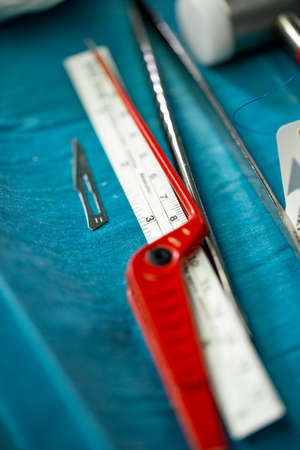 Set of sterile instruments laid out on the table for an operation on a blue cloth