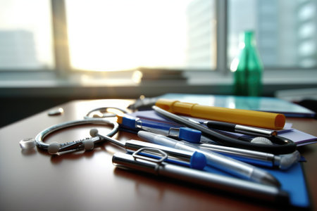 A collection of various tools spread out on a table for easy access during a project, Surgical instruments in a surreal art style, AI Generated
