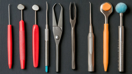 A detailed arrangement of various dental tools showcasing precision instruments used in oral care, emphasizing their functional design for effective hygiene and treatment.