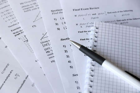 Handwriting of mathematics quadratic equation on examination, practice, quiz or test in maths class. Solving exponential equations background concept.
