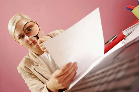 work environment- woman with a magnifying glass over some paperwork in modern office-on pink