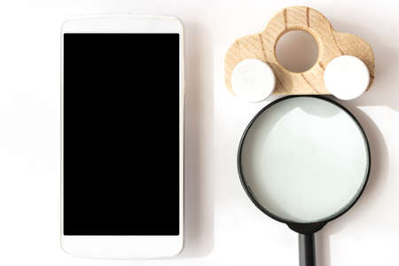 Business woman hold magnifier and a mobile phone