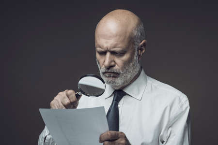 Businessman checking a document using a magnifier, contracts and agreements concept