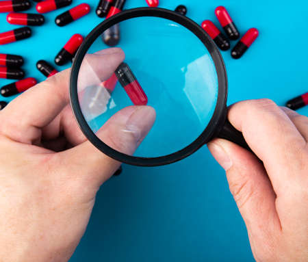 hand with a magnifying glass looking at pills. Medicine experimentl conceptual