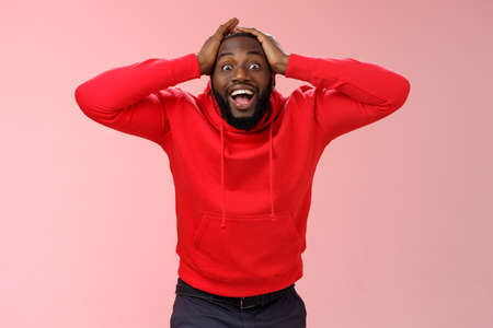 Close-up male portrait young surprised stunned excited shocked serious african american man holding hands on face surprise saying wow getting unbelievable sad news feeling shock surprise amaze wonder