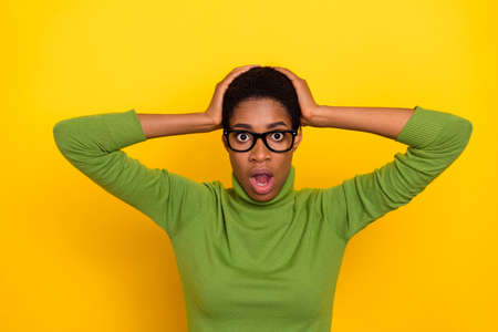 Photo of shocked impressed short hair lady dressed green turtleneck hands arms head isolated yellow color background