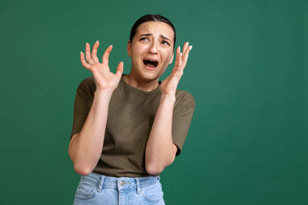 Portrait of young man screaming. Looking up in anger and making angry hand gestures.