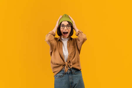 Shocked woman raising hands up and touching head over yellow studio background, emotional lady expressing amazement