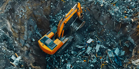 Excavator with log grab crane sorting construction waste at a landfill for recycling and reuse. Concept Construction Waste Management, Excavator Operation, Recycling Processes, Landfill Sorting
