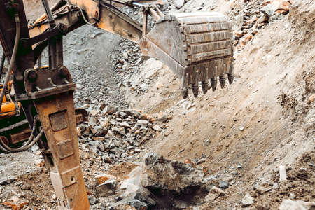 Crawler excavator with hydraulic breaker hammer for the destruction of concrete and hard rock at the construction site or quarry. Jackhammer using without blasting method. Hard rock demolition