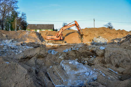 Excavator at earthworks on construction site. Backhoe loader digs a pit for the construction of the foundation. Digging trench for laying sewer pipes drainage in ground. Earth-Moving Heavy Equipment
