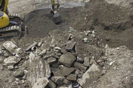 Excavator at landfill the load concrete waste in a mobile jaw crusher machine. Disposal of construction waste. Recycling concrete and asphalt from demolition. Re-use concrete after demolition.