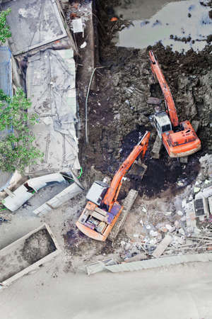 Several workers are working on the construction site with excavators