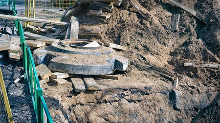The sewer hatch lies on a heap of construction debris and a pile of sand fenced with a fence.