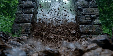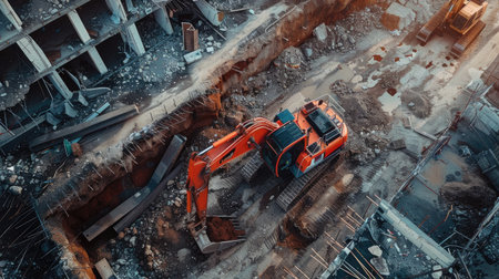 Heavy machinery working on construction site, unloading dirt and concrete generated by artificial intelligence
