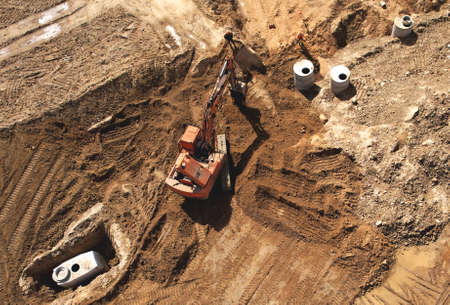 Excavator dig ground at construction site. Foundation pit for a multi-story building. Earth-moving heavy equipment. Arial view of the Digger on earthworks. Trench for laying external sewer pipes.