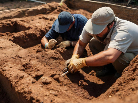 Dusklit medium shot of meticulous digging revealing distinct soil layers and ancient relics foreground in crisp detail background softly blurred.