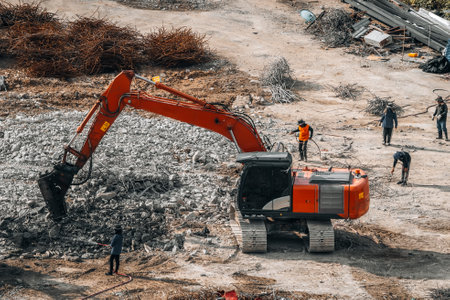 A hydraulic excavator that crushes concrete at a construction site