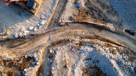 This aerial image captures a construction site with distinct excavator tracks on gravel and dirt surfaces, showcasing machinery and developing land in natural light.