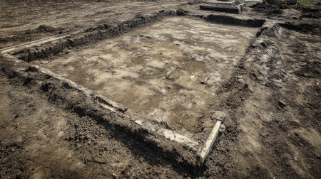 A dry excavation site showing a marked foundation outline with wooden beams, ideal for construction projects and groundwork preparations in rural settings.