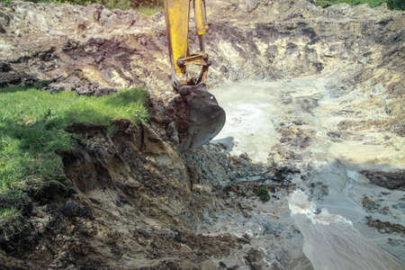 An excavator digs a large trench for building a house. A tractor digs a large lake that is already gaining water. Stock background for design