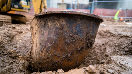 A close-up view of a construction excavator bucket resting in wet soil at a building site, capturing the details of construction equipment and muddy terrain.