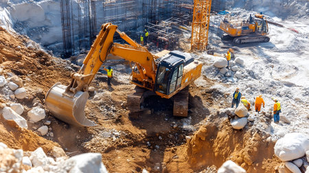 Earth mover: excavator at work, strength and engineering of construction equipment it carves out terrain, pivotal in site preparation and infrastructure development.