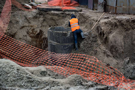 Kiev, Ukraine, October 17, 2018: Workers in the mud of a construction site at the stage of excavation; construction of a supermarket AUCHAN
