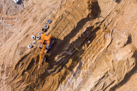 Excavator dig ground at construction site. Foundation pit for a multi-story building. Earth-moving heavy equipment. Arial view of the Digger on earthworks. Trench for laying external sewer pipes.