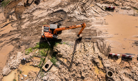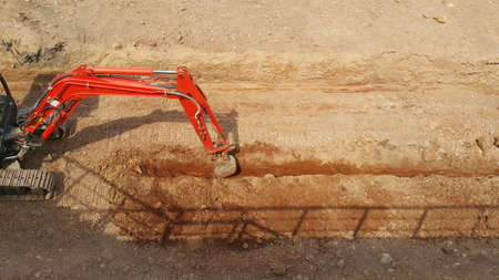 A high-angle shot showcases an excavator digging a trench in brown earth. Surrounded by piles of soil and construction debris, it emphasizes construction activity.