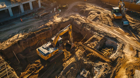 Aerial View of Excavator at Busy Construction Site During Sunset. Concept of Urban Development, Heavy Machinery, Industrial Progress, and Construction Industry.