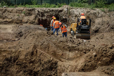During earthworks at construction site, an excavator prepares trench for sewer pipes