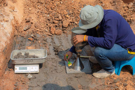 Worker using equipment for testing laboratory field density test sand cone method and soil density test of road under the construction.Soil field density test sand cone method calculation .
