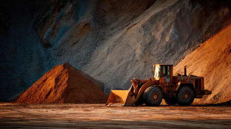 A robust loader stands resolutely at a construction site, surrounded by piles of soil and gravel. The golden hour casts a warm glow, highlighting the heavy machinery at work in this vibrant landscape.