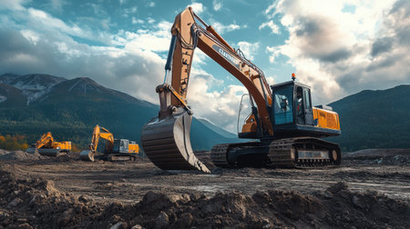 A powerful excavator performs heavy-duty work at a construction site, highlighting the capabilities of modern machinery amidst a stunning natural backdrop of mountains and clouds.