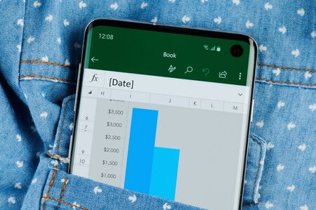 New york, USA - June 28, 2019: Microsoft excel application on smartphone screen close up view in shirt pocket