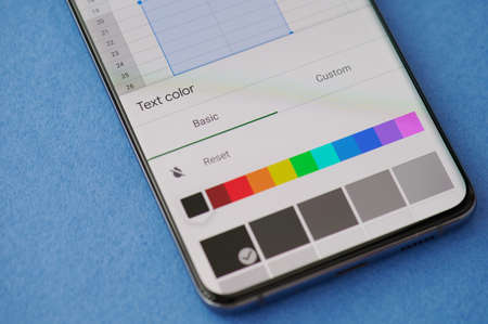 New york, USA - June 28 2021: Changing text color in Microsoft excel on smartphone screen close up