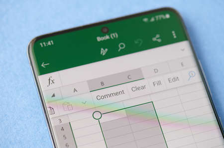 New york, USA - June 28 2021: Editing cells in excel spreadsheet on smartphone screen close up