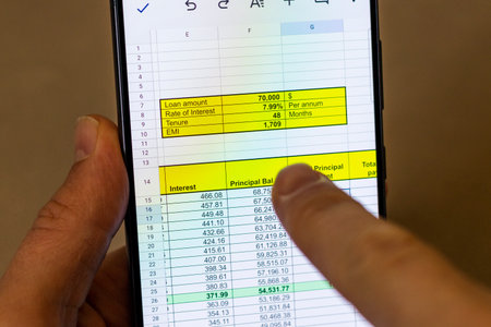 Man scrolling an excel sheet on the phone screen showing bank loan amortization table.