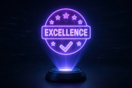 Vibrant neon purple holographic badge displaying excellence with stars and a checkmark, projected from a sleek digital device. represents quality, achievement, and premium service in a futuristic setting.