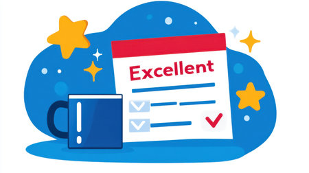This vibrant illustration showcases an excellent report card next to a coffee mug, surrounded by stars and sparkles, symbolizing achievements and celebration.