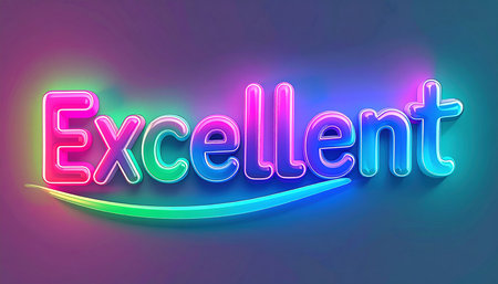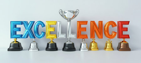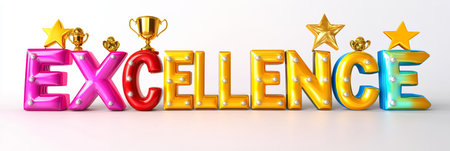 Excellence Word Art with Vibrant Colored Letters, Awards, Trophies on White Background
