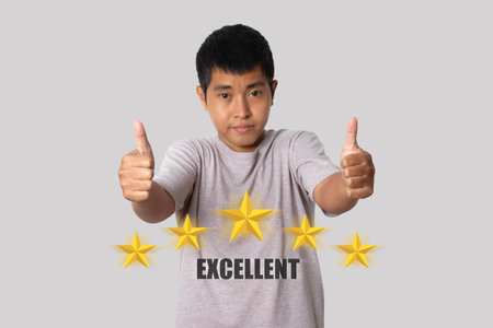 Man choosing screen on five star icon to give satisfaction in service rating very impressed. Excellent rating customer service experience. Concept of customer service and satisfaction.