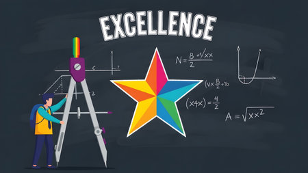 A student uses a compass near a colorful star on a blackboard with math equations. Clear details ...