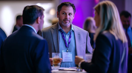 Business professionals socialize at conference exchanging ideas and networking over drinks. Concept Networking, Business Conferences, Professional Socializing, Idea Exchange, Drinks Networking