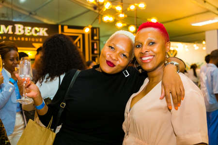 Johannesburg, South Africa - October 11 2018: African Female Friends eating, drinking and generally enjoying a day out at a Food and Wine Fair