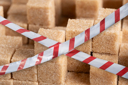 Cubes cane sugar with red and white warning tapes, closeup.