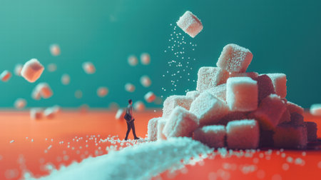 A monumental pile of sugar cubes builds a mountain of temptation and excess, the pale blocks contrasting with the dark backdrop in a scene that suggests indulgence and its potential consequences. The image is both inviting and warning, a sweet but stark landscape.
